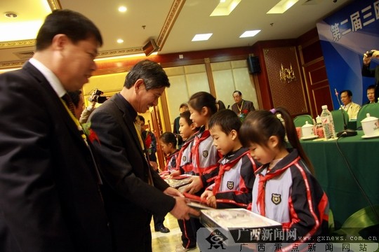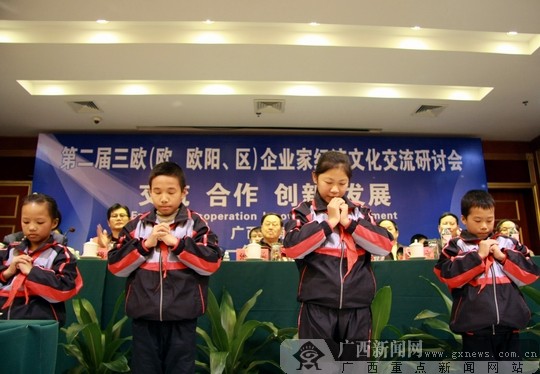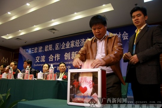 当天,来自广东、海南、福建、浙江、广西以及新加坡、泰国等地的约150位“三欧”姓氏的企业家、知名人士,出席了第二届“三欧”(欧、欧阳、区)企业家经济文化研讨会,并慷慨解囊,为广西南宁市明天(孤儿)学校捐款和捐助保暖内衣。