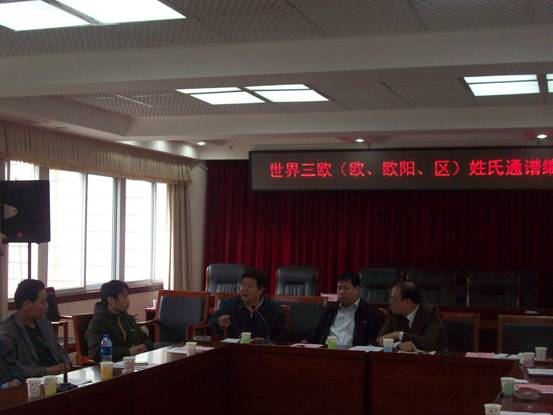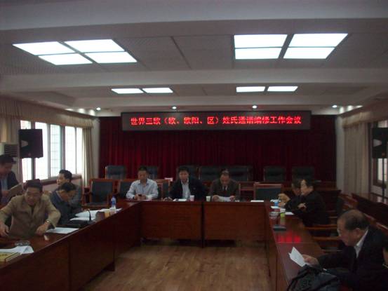 2012年10月26日至28日,金秋十月,橘子飘香,在惟楚有才的湖南长沙,世界三欧文化研究会组织召开了三欧姓氏通谱编修工作会议,世界三欧宗亲联谊会常务副会长欧建勇、常务副会长兼文化研究会会长欧阳秉乾、副会长欧泰星、秘书长欧泽荃,三欧姓氏通谱主编欧巨文、副主编欧阳包、欧继陶,编委会成员欧阳健、欧阳鹏、欧阳玉模、欧阳晓东、欧阳子韩、欧振发、欧阳伟、欧阳明东、欧阳文联等20余人参加。