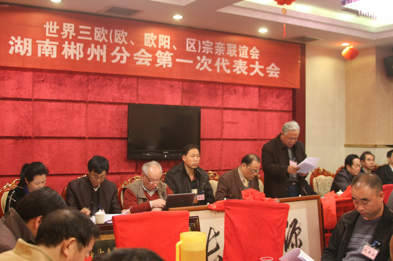 世界三欧(欧、欧阳、区)宗亲联谊会常务副会长兼文化研究会会长欧阳秉乾宣布批复并授牌。之后,新任会长欧阳玉模讲话,他就今后的工作讲四点意见:1、三欧族人一家亲。三欧宗亲联谊要以遵纪守法为前提,在血亲友情联谊的基础上,进一步开展事业联谊、经济联谊、文化联谊。在经济互帮互助中,不断弘扬三欧氏族的优良传统和爱国爱族遗风,把三欧宗亲联谊会真正建设成为全市族人共同的大家庭。在这里没有高低贵贱之分,不论是政府官员,还是普通百姓,不论是大小老板和务工人员,都是平等的一家人。这个家不仅要成为联络三欧氏族宗亲的纽带,沟通三欧氏族的桥梁,更是传承弘扬三欧氏族传统文化和科学发展经济的重要媒介与平台。2、以族谱编纂为己任。《世界三欧通谱》有我们郴州的篇章。按照《世界三欧通谱》的“统一字辈”和“网络主干”,以及现代人修现代谱的要求,积极编写高标准、高质量、现代化的三欧族谱,是全族宗亲的重托,是当代编修人士当仁不让、责无旁贷的己任。一支笔牵动万人心,必须举全族之力支持这一光宗耀祖、兴家旺族的工作。3、整合资源促经济。世界三欧郴州分会作为带领全市宗亲共同致富的组织机构和服务机构,离不开企业家商会这根实力支柱。郴州分会与企业家商会、文化研究会三会之间互相依存、密不可分。坚持“以会促商,以商养会”原则,实质就是整合资源,把三欧各地有用的人才,有限的资金,分散的技术,相应地集中起来,从小生意做起,逐渐、稳步地建设起族内能适应市场经济、顶挡市场风险的集约型氏族经济。只有企业商会“旺”起来了,有了强大的资金作保障,三欧宗亲联谊会的各项工作才能持续稳定地开展下去。4、打铁全靠自身硬。“三会”领导班子成员,既是我市三欧氏族大家庭的当家人,更是宗亲族人的服务员。如何与时俱进,提高服务水平是摆在我们面前的首要选择。我们一定要从思想上、组织上、制度上、工作上不断创新发展。努力把联谊组织和商会组织、文化研究会组织建设成为自我管理、自我教育、自我服务、自我约束、自我发展的宗亲组织。作为会长,首先要严格要求自己,当好这个“家长”,加强学习,敢作敢为,淡泊名利,无私奉献。要学习大禹治水三过家门而不入的忘我精神;学习越王勾践卧薪尝胆、二十年光复越国、称霸中原的吃苦精神,学习欧阳修身居高位、两袖清风,只有“六个一”的廉政精神,以良好的族德族风带动全市族人为三欧大家庭多做好事、多做实事,不负众望,不辱使命地努力开创宗亲联谊、宗亲建业的新局面,为社会的和谐发展,为实现伟大的中华民族复兴的中国梦作出新的贡献。